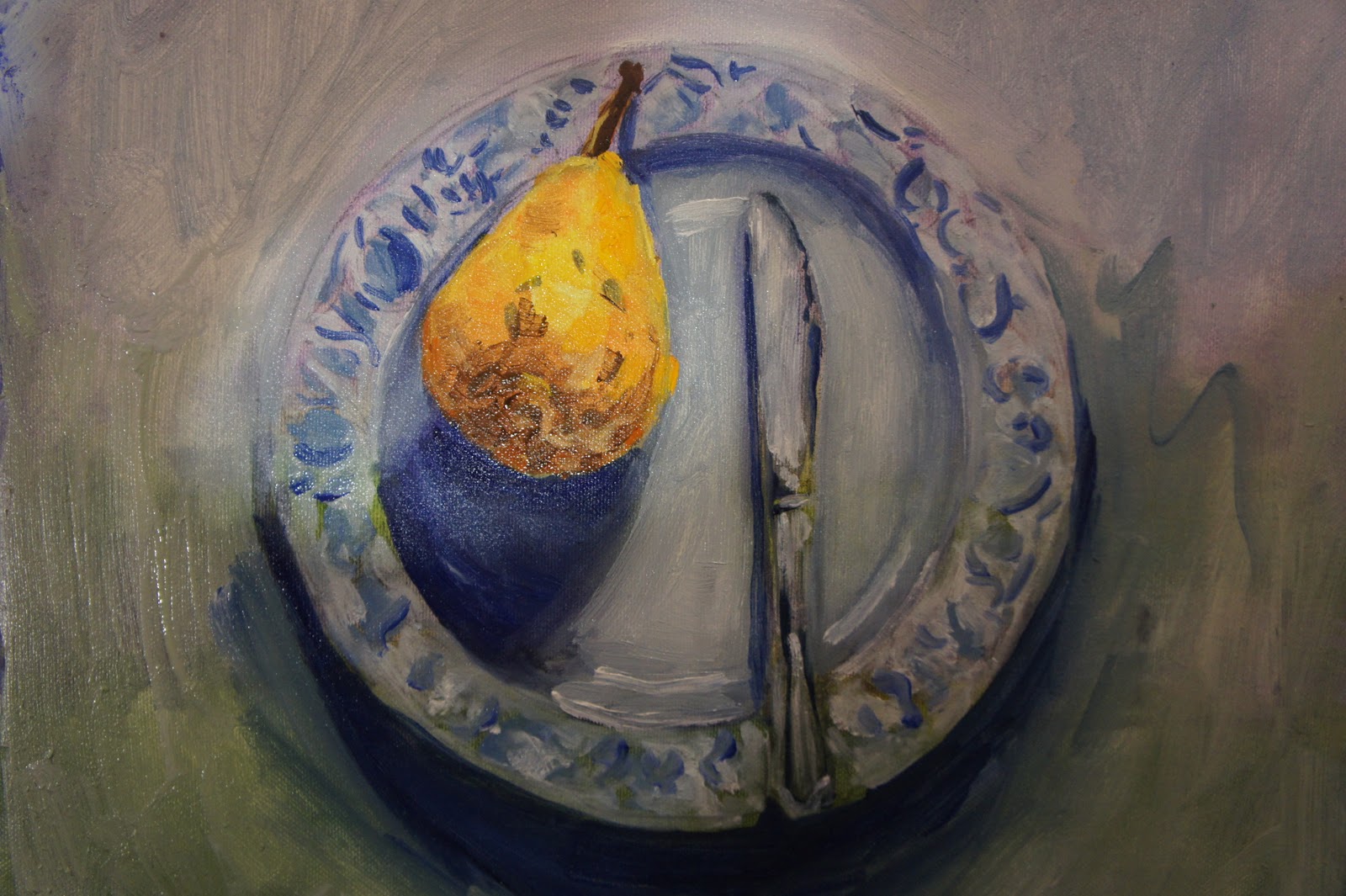 Day two of the imaginatively titled still life 'Pear, Knife, Plate'. I'm painting with a restricted colour palette.